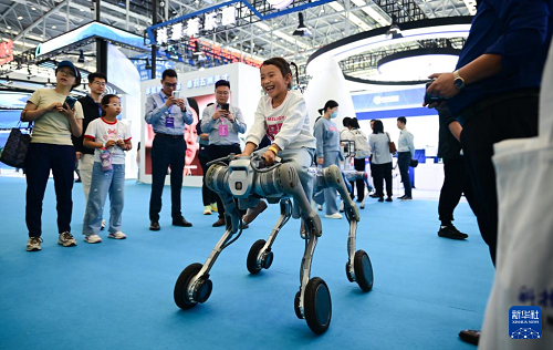 4月26日,小朋友在第三屆中國(安徽)科技創(chuàng)新成果轉(zhuǎn)化交易會(huì)上體驗(yàn)一款機(jī)器狗。(新華社記者 周牧 攝)