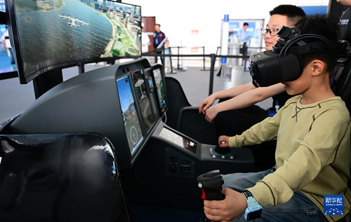 4月26日,小朋友在第三屆中國(安徽)科技創(chuàng)新成果轉(zhuǎn)化交易會(huì)上體驗(yàn)一款駕駛艙模擬器。(新華社記者 周牧 攝)