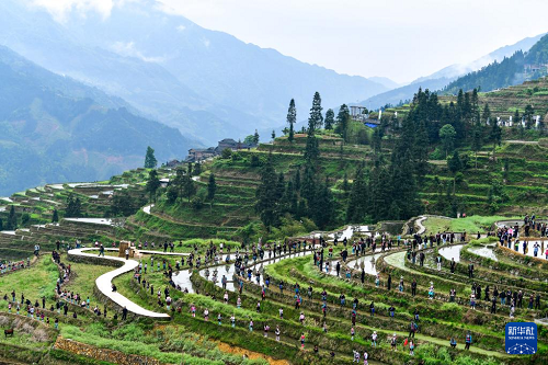 4月26日,村民在貴州省從江縣加榜梯田上參加梯田走秀活動。(新華社記者 楊文斌 攝)