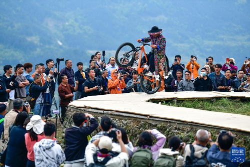 4月26日,表演者在貴州省從江縣加榜梯田的梯田走秀活動上展示車技。(新華社記者 楊文斌 攝)
