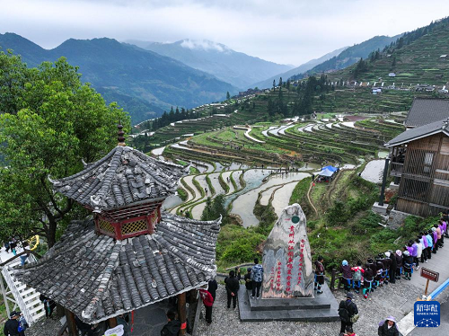 4月26日,游客在貴州省從江縣加榜梯田上觀看“開秧門”春耕儀式(無人機照片)。(新華社記者 楊文斌 攝)