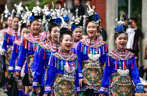 4月26日,少數(shù)民族姑娘們在貴州省從江縣加榜梯田“開秧門”巡游儀式中演唱歌曲。(新華社記者 楊文斌 攝)