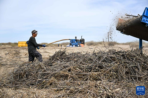 4月28日,在杭錦旗境內(nèi)的庫布其沙漠,治沙工人在平整裁剪后的沙柳。(新華社記者 李志鵬 攝)