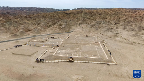 4月29日,嘉賓在世界文化遺產(chǎn)懸泉置遺址參觀(無(wú)人機(jī)照片)。(新華社記者 郎兵兵 攝)