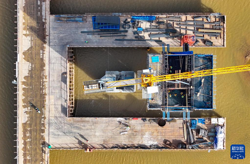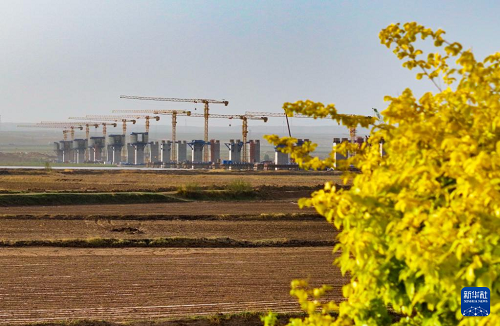 5月8日拍攝的國道110線磴口黃河大橋施工現(xiàn)場(無人機照片)。(新華社發(fā) 王正 攝)