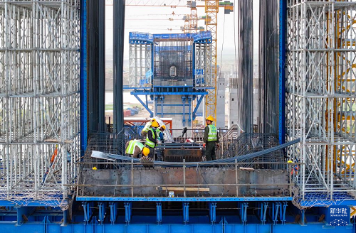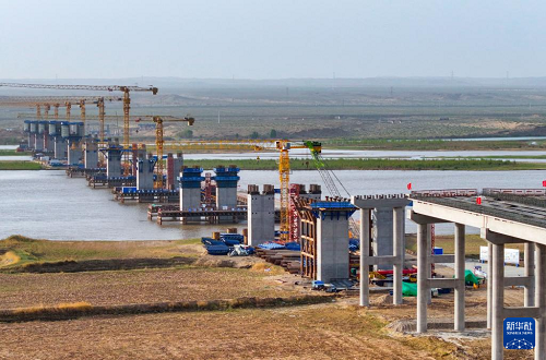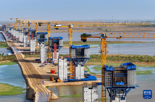 5月8日拍攝的國道110線磴口黃河大橋上部箱梁懸澆施工現(xiàn)場(無人機照片)。(新華社發(fā) 王正 攝)
