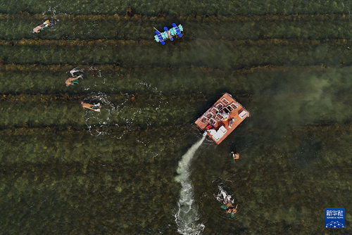 5月12日,河北省昌黎縣茹荷鎮(zhèn)一家海參養(yǎng)殖合作社的工人在捕撈海參(無(wú)人機(jī)照片)。(新華社記者 楊世堯 攝)