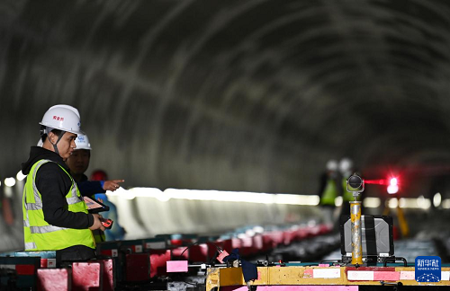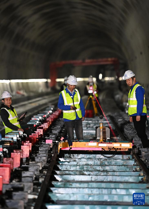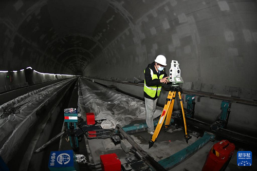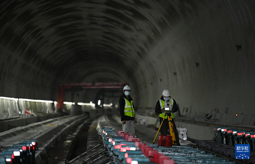 5月13日,在貫通的西康高鐵秦嶺九天山隧道內(nèi),施工技術(shù)人員在無砟軌道作業(yè)現(xiàn)場采集精調(diào)數(shù)據(jù)。(新華社記者 李一博 攝)