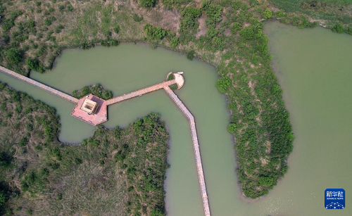 這是黃河三角洲國家級自然保護區(qū)內(nèi)的濕地(5月14日攝,無人機照片)。(新華社記者 徐速繪 攝)