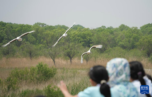 5月14日,幾只丹頂鶴在黃河三角洲國家級自然保護區(qū)內(nèi)飛翔。(新華社記者 徐速繪 攝)