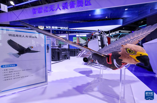 5月14日在第十二屆中國(guó)國(guó)際警用裝備博覽會(huì)智慧化無(wú)人裝備展區(qū)拍攝的特巡用無(wú)人AI偵測(cè)鳥(niǎo)。(新華社記者 殷剛 攝)
