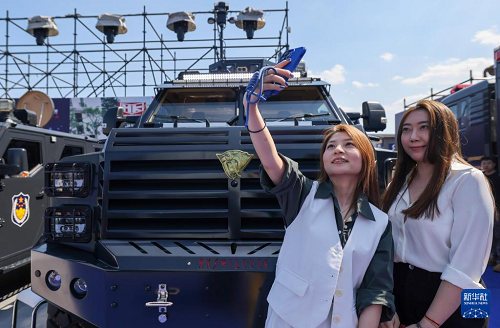 5月14日,在第十二屆中國(guó)國(guó)際警用裝備博覽會(huì)上,觀眾在警用車(chē)前自拍留影。(新華社記者 殷剛 攝)