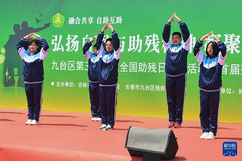 5月15日,在吉林省長春市九臺區(qū)善滿家園殘障人綜合服務(wù)中心,九臺區(qū)特殊教育學(xué)校的殘障學(xué)生表演手語舞蹈。(新華社記者 張楠 攝)
