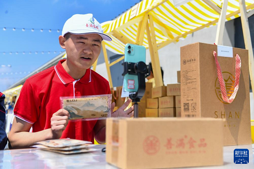 5月15日,在吉林省長春市九臺區(qū)善滿家園殘障人綜合服務(wù)中心,殘障員工在網(wǎng)絡(luò)直播間向網(wǎng)友介紹產(chǎn)品。(新華社記者 張楠 攝)