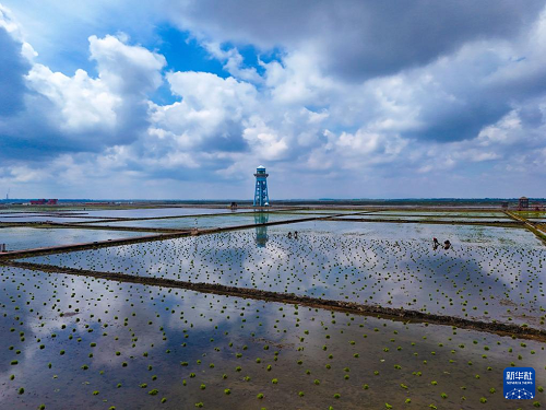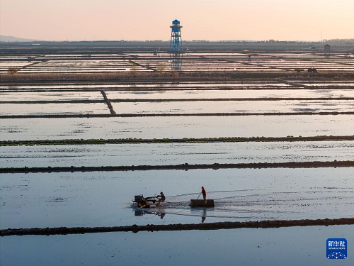 在黑龍江省佳木斯市富錦市的萬畝水稻公園,一塊塊稻田宛若“天空之鏡”,勞動者在“鏡”中插秧作業(yè),與藍天白云、夕陽霞光構(gòu)成壯美的農(nóng)耕圖景。