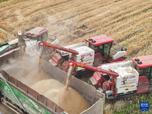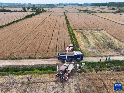 在盱眙縣種糧大戶劉凱的承包田旁,收割機(jī)將小麥裝車(5月27日攝,無(wú)人機(jī)照片)。(新華社記者 季春鵬 攝)