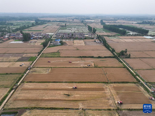 在盱眙縣種糧大戶劉凱的承包田,農(nóng)機(jī)手駕駛收割機(jī)搶收小麥(5月27日攝,無(wú)人機(jī)照片)。(新華社記者 季春鵬 攝)
