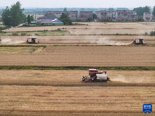 5月27日,在盱眙縣種糧大戶劉凱的承包田,農(nóng)機(jī)手駕駛收割機(jī)搶收小麥。(新華社記者 季春鵬 攝)