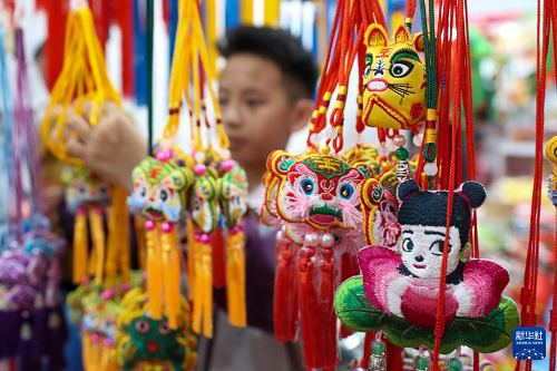 5月29日,市民在慶陽(yáng)香包民俗文化節(jié)非遺沉浸體驗(yàn)區(qū)選購(gòu)香包。(新華社記者 郎兵兵 攝)