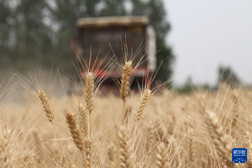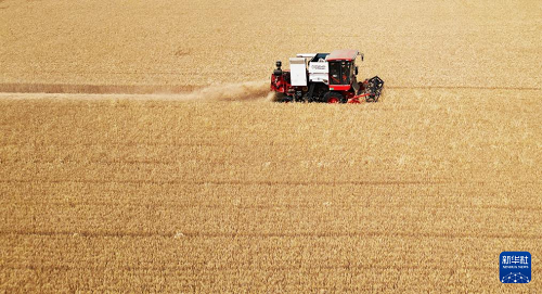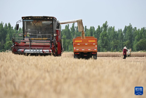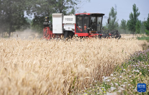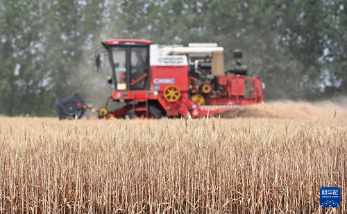 6月2日,農(nóng)機(jī)手駕駛聯(lián)合收割機(jī)在山東省聊城市茌平區(qū)賈寨鎮(zhèn)草林張村麥田里收割小麥。(新華社發(fā) 趙玉國(guó) 攝)