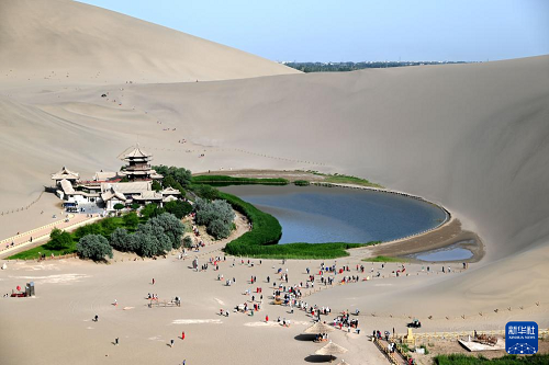 5月31日,游客在甘肅省敦煌市鳴沙山月牙泉景區(qū)游覽。(新華社發(fā) 張曉亮 攝)