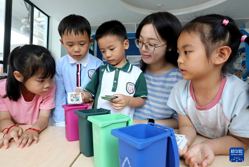 6月3日,在江蘇省蘇州市姑蘇區(qū)平潤實驗幼兒園開展的“保護(hù)環(huán)境 從我做起”活動中,小朋友在模擬垃圾分類投放。(新華社發(fā) 杭興微 攝)