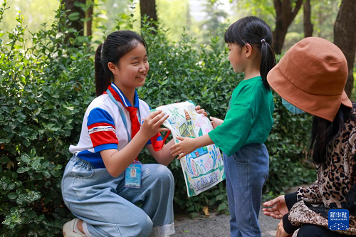 6月3日,山東省棗莊市薛城區(qū)雙語實驗小學(xué)在薛城區(qū)城市森林公園開展“手繪環(huán)保袋 傳遞綠色夢”主題活動。這是學(xué)生給路人贈送手繪環(huán)保袋。(新華社發(fā) 王龍飛 攝)