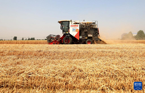 6月12日,收割機在河北省邢臺市隆堯縣雙碑鄉(xiāng)西良村麥田里收獲小麥。(新華社記者 牟宇 攝)