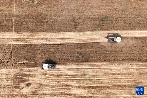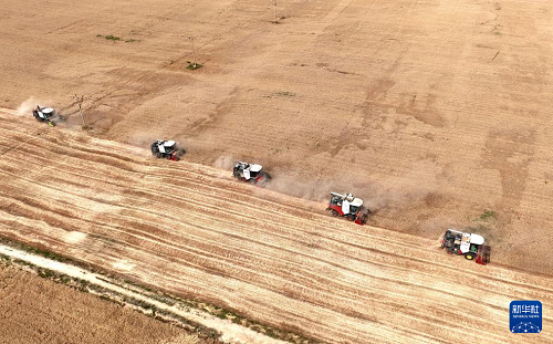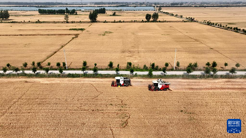 6月12日,收割機在河北省邢臺市隆堯縣雙碑鄉(xiāng)西良村麥田里收獲小麥(無人機照片)。(新華社記者 牟宇 攝)
