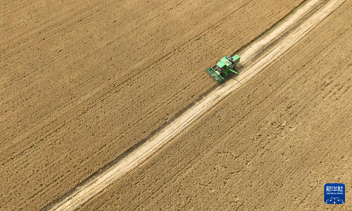 6月18日,河北石家莊晉州市周家莊鄉(xiāng)北捏盤村農(nóng)戶駕駛聯(lián)合收割機(jī)收割小麥(無(wú)人機(jī)照片)。(新華社發(fā) 梁子棟 攝)