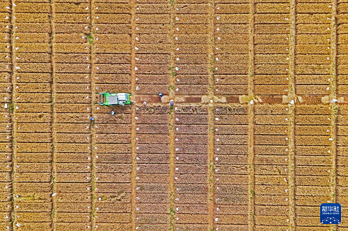 6月18日,收割機(jī)在山東省煙臺(tái)市一處試驗(yàn)田里收割小麥(無(wú)人機(jī)照片)。(新華社發(fā) 孫文潭 攝)