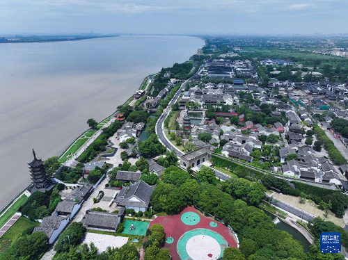 6月19日,空中俯瞰毗鄰錢塘江的鹽官古城潮樂之城(無人機(jī)照片)。(新華社記者 徐昱 攝)
