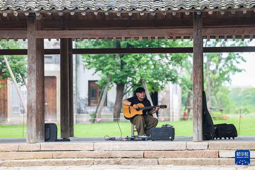6月19日,一名樂手在鹽官古城潮樂之城內(nèi)演唱民謠作品。(新華社記者 徐昱 攝)