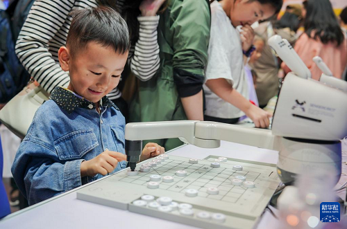 6月22日,小朋友在第9屆南博會上與機器人對弈。(新華社記者 高詠薇 攝)