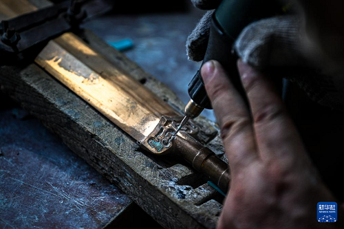 6月16日,在荊州市公安縣埠河鎮(zhèn),敖興華在工作坊內鑲嵌劍格。(新華社記者 杜子璇 攝)