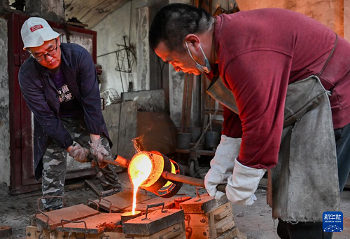 6月17日,在荊州市公安縣埠河鎮(zhèn),敖興華(右)和弟弟在工作坊內進行銅水澆鑄。(新華社記者 杜子璇 攝)