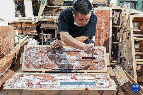 6月24日,在荊州市公安縣埠河鎮(zhèn)的工作坊內,敖興華在雕刻用來制作模具花紋的花板。(新華社記者 杜子璇 攝)