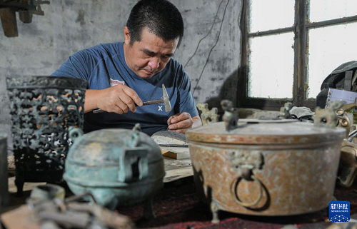 鉛錫刻鏤技藝是用于制作、復制古代青銅器的一種制模技藝,2011年入選國家級非物質文化遺產名錄。該技藝利用鉛錫柔軟延展的特性,通過打擊、扭曲、編織、擠壓、刻鏤等手法,把平面紋飾和立體、鏤空等造型結合起來,最終完成特定的模型。