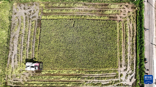 7月2日,在廣西欽州市康熙嶺鎮(zhèn)板坪村,農(nóng)民駕駛收割機收獲稻谷(無人機照片)。(新華社記者 張愛林 攝)