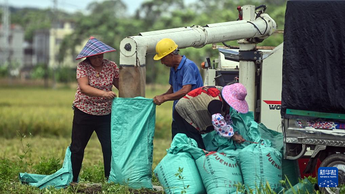 7月2日,廣西欽州市康熙嶺鎮(zhèn)板坪村的村民將收割機收獲的稻谷裝袋。(新華社記者 張愛林 攝)