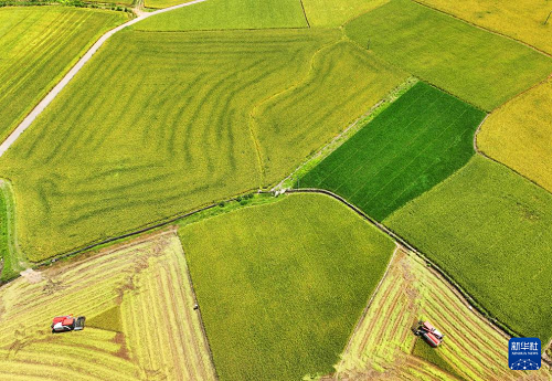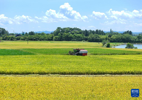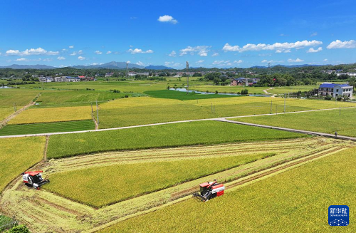 7月3日,在湖南省衡陽(yáng)市衡山縣白果鎮(zhèn),村民駕駛收割機(jī)收割早稻(無(wú)人機(jī)照片)。(新華社發(fā) 曹正平 攝)