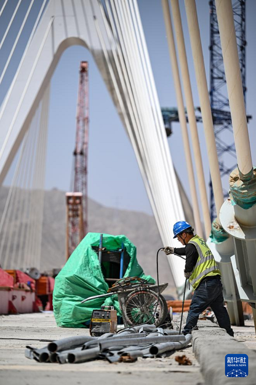 7月3日,工人在黑山峽黃河特大橋建設現(xiàn)場施工作業(yè)。(新華社記者 馮開華 攝)