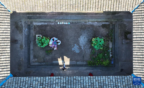 7月3日,游客在五泄鎮(zhèn)古民居內(nèi)體驗(yàn)漆扇制作(無(wú)人機(jī)照片)。(新華社記者 翁忻旸 攝)
