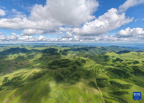 這是7月5日拍攝的敕勒川高山草原風(fēng)光(無人機(jī)拼接照片)。(新華社記者 馬金瑞 攝)