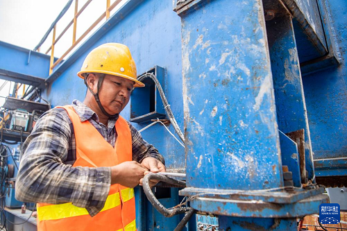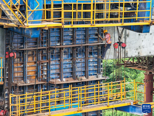 7月8日,工人在成渝中線高鐵土橋樞紐互通雙線特大橋建設(shè)現(xiàn)場施工作業(yè)。(新華社記者 唐奕 攝)