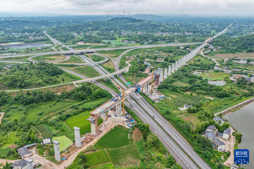 這是7月8日拍攝的成渝中線高鐵土橋樞紐互通雙線特大橋建設(shè)現(xiàn)場(無人機(jī)照片)。(新華社記者 唐奕 攝)