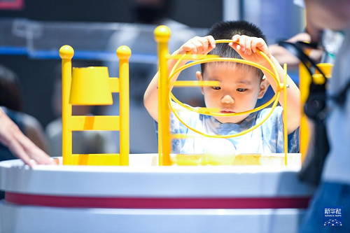 7月8日,小朋友在河北省科學技術館體驗科普設備。(新華社發(fā) 張曉峰 攝)