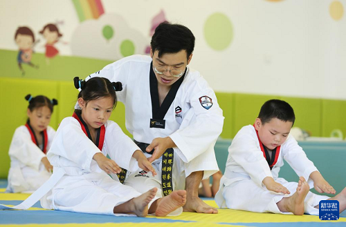 7月7日,在浙江省湖州市德清縣乾元鎮(zhèn)直街社區(qū)青少年宮,孩子在老師指導下學習跆拳道。(新華社發(fā) 倪立芳 攝)