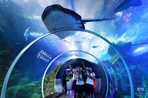 7月8日,山東省青島市市北區(qū)東勝路小學的孩子們在“海底隧道”參觀。(新華社發(fā) 王海濱 攝)