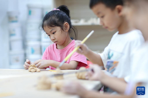 7月8日,在江蘇省興化市昭陽街道,小朋友在老師指導下制作陶藝作品。(新華社發(fā) 周社根 攝)